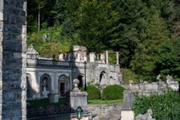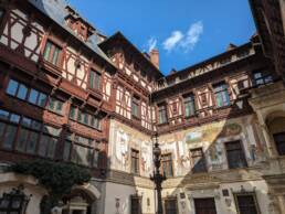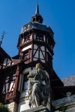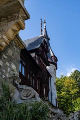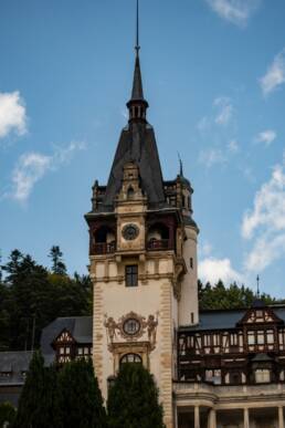 Man geht vom Parkplatz über eine kopfsteingepflasterte Straße und kann sich gut vorstellen, wie hier früher die Kutschen auf das Schloss zugerattert sind. Sehr eindrucksvoll erhebt sich Castelul Peleș auf einem Hügel und thront zwischen großen „Schwarzwaldtannen“. Dieses Schloss möchte beeindrucken und hat sicher vielen Feierlichkeiten einen angemessenen Rahmen geboten.