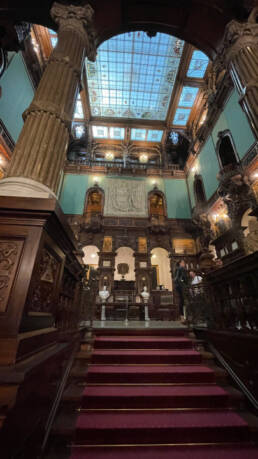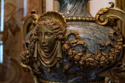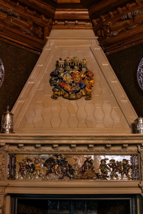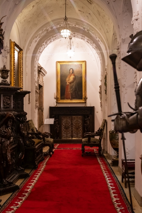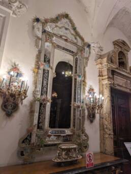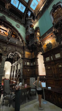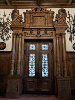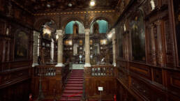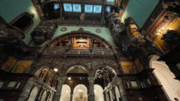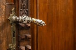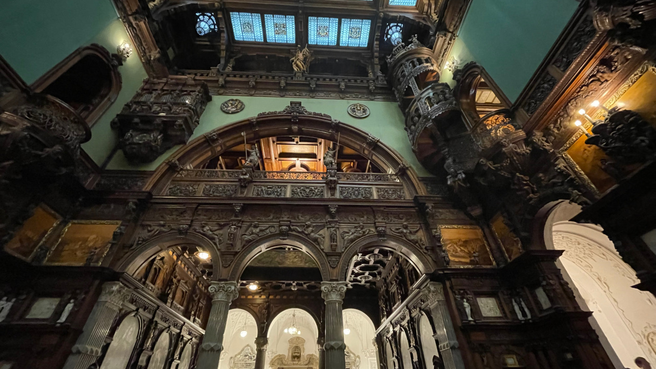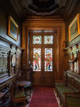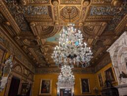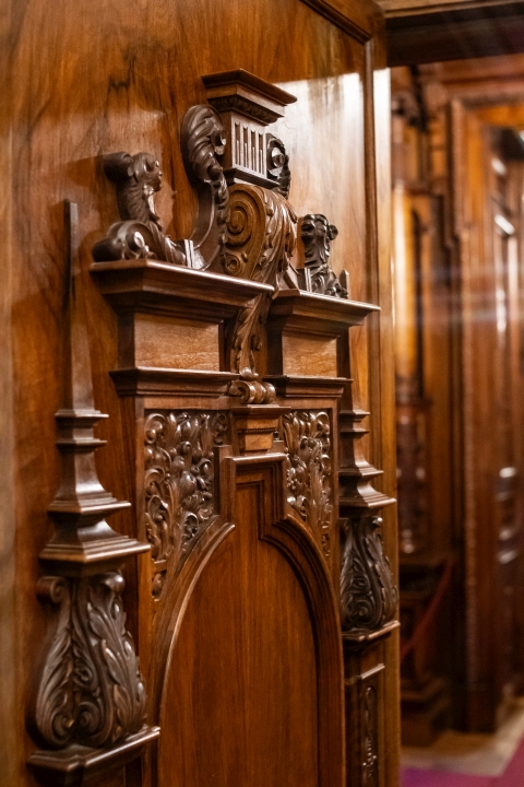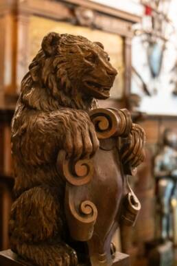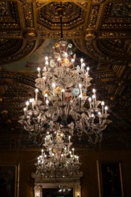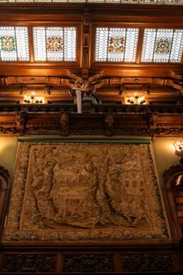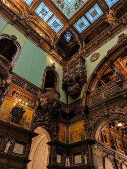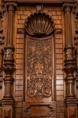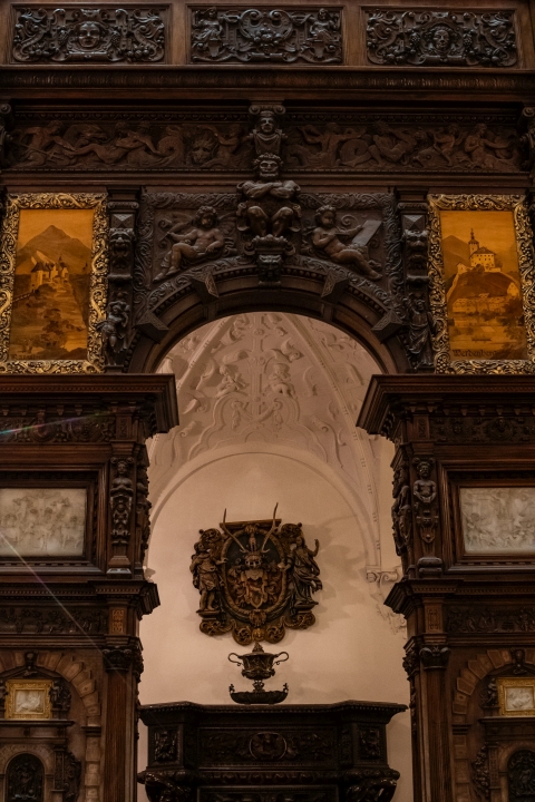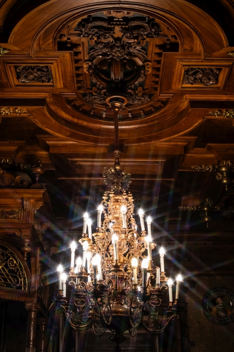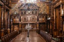 Prunk ist Trumpf, was die Fassaden mit vielen Details versprechen, setzt sich im Innern uneingeschränkt fort. Dunkles, reich verziertes und geschnitztes Holz an den Wänden und sogar Decken, dominiert die Räume. Durch entsprechend ausladende Kronleuchter und Kerzenhalter funkelt es aber überall.