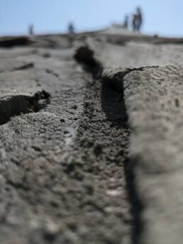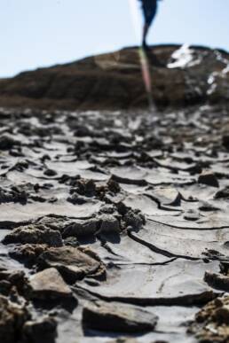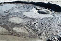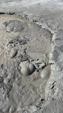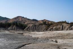 Am eigentlichen Gelände angekommen, bezahlt man den Eintritt und kann sich dann überall frei bewegen. Man bekommt direkt den Eindruck einer Mondlandschaft, durch die Krater und schlammigen Löcher, in denen es mal mehr mal weniger stark blubbert und brodelt. Zum Teil sind die Krater verbunden durch ausgetrocknete Furchen. Dadurch das wir einen heißen Tag erwischt hatten und es auch schon länger nicht geregnet hatte, war es recht trocken und man konnte die Löcher gut sehen. Spuren im zumeist ausgetrocknetem Schlamm erzählten aber auch eine andere Geschichte. Wenn hier alles nass ist, wird es eine rutschige Angelegenheit und sicher auch nicht mehr so einfach die Löcher zu erkennen. Ein Fehltritt jedoch kann schnell gefährlich werden. Der Schlamm der Vulkane kommt teilweise aus bis zu 3 km Tiefe.