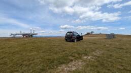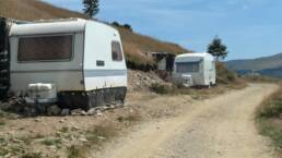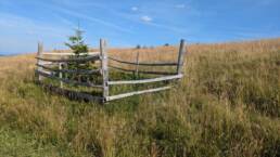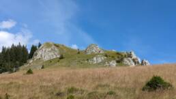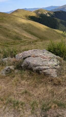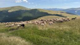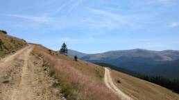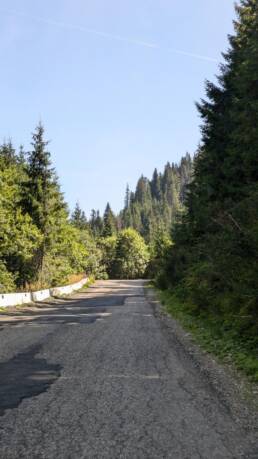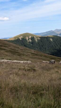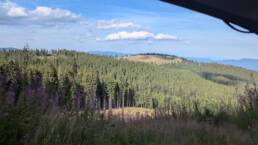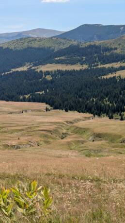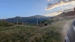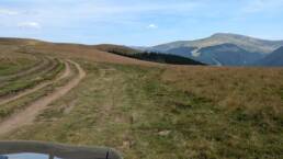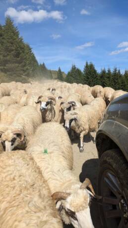 Man hat fast die ganze Zeit über einen irren Weitblick auf die Karpaten mit klar sichtbarer Baumgrenze (bis auf ein paar Ausreißer). Einem Abzweig, der von der „Strategica“ wegführt,  konnten wir nicht widerstehen, hatten wir doch dort oben eine „Bushaltestelle“ erspäht. Ganz zu Beginn ist ein weißer Citroen (Kleinwagen) an uns vorbei gefahren und wen treffen wir auf diesem Abstecher, der mit unseren 4×4 kaum zu bewältigen war? Den weißen Citroen samt Besitzer! Der hatte an einer von Wasser ausgewaschenen Stelle Probleme bekommen und konnte nicht weiter. Er werkelte schon mit Wagenheber rum – was auch immer er damit vorhatte. Jedenfalls hatte er sich damit schlimm am Finger verletzt. Das Blut sickerte schon durch seinen provisorischen Verband. Schnell verschwand er kurz in seinem Auto, parkte es um damit wir mehr Platz haben, riss sich noch einige Textiltücher zurecht und wickelte sie um seine Finger. Trotz Allem hat er sofort einige Hölzer über die Schikane gelegt und meinte mit Handgesten, dass wir durchfahren sollen 😀 Er hob vier Finger und wollte wissen ob wir Allrad haben. „Ja? Dann klappt das schon!“ – lies er uns auf gebrochenem aber verständlichem rumänischem englisch wissen. Ich (Marco) war skeptisch. Die Stelle sah trotz der Hölzer nicht gut aus. Der Rumäne fuchtelte derweil mit seinen blutigen Fingern weiter und meinte wir sollen ein Stück zurück und oben über die Wiese fahren. Geht doch auch mit Allrad. Joah, würde wohl auch gehen. Wieso auch immer Strasse fahren? Aber nee, nu hat er die Hölzer so schön drappiert, also rüber da! Wir haben es versucht und es hat natürlich geklappt. Wir sind dann noch eine Weile mit dem Mann im Gespräch gewesen, er hat uns etwas die Gegend und Natur erklärt. An der Hängen jenseits der Baumgrenze wachsen flache Büsche mit Blauberen, gut für den Magen (aus den Blättern macht man Tee, der ist gut für die Lunge – wusstet ihr das?). Kurz darauf kam noch ein Schäfer mit seinen 250 Schafen, einer Ziege und einem Esel dazu. Einmal im Flow haben auch wir mit den beiden Selfies gemacht. So nette Leute hier 😍😍 Übrigens haben wir etwas später festgestellt, dass wir hier auf fast 2000 Metern ja feinstes Internet haben. Verrückt – aber so konnten wir uns Dank Google Übersetzer mit den beiden unterhalten (daher auch die Info mit den Anzahl der Schafe – selber gezählt haben wir nicht 😅)