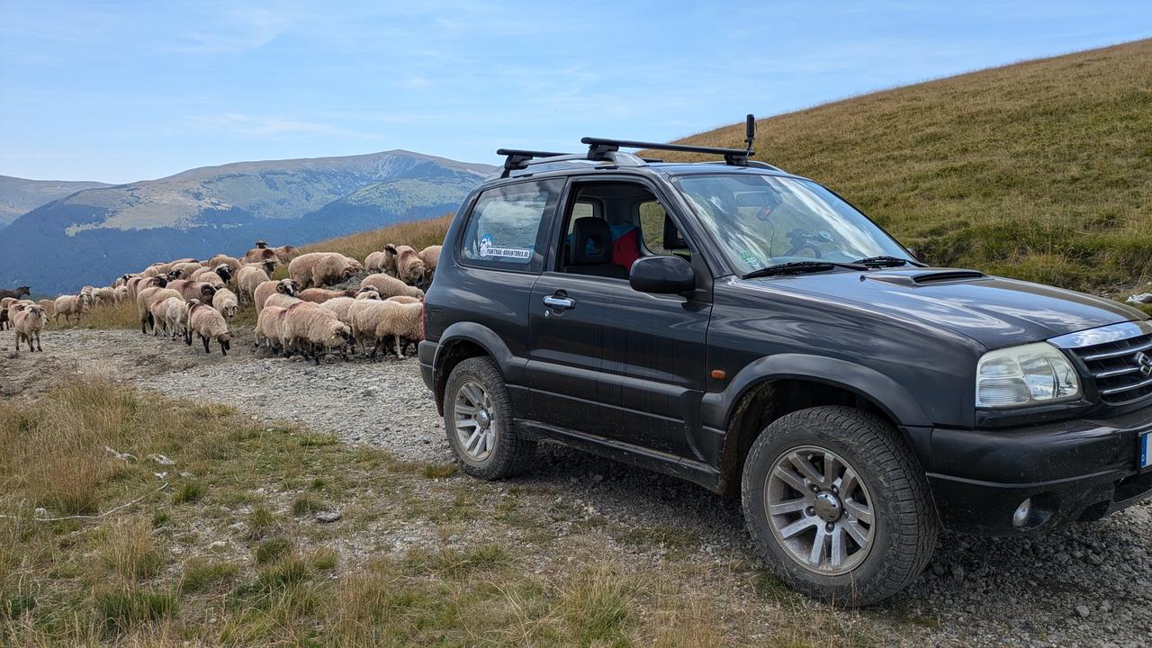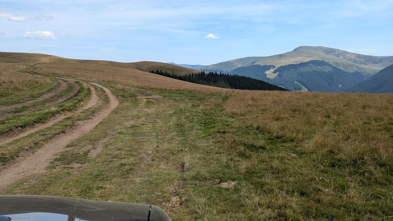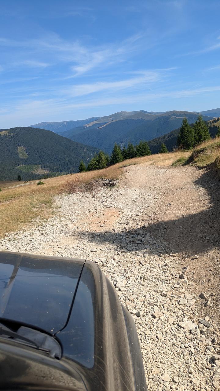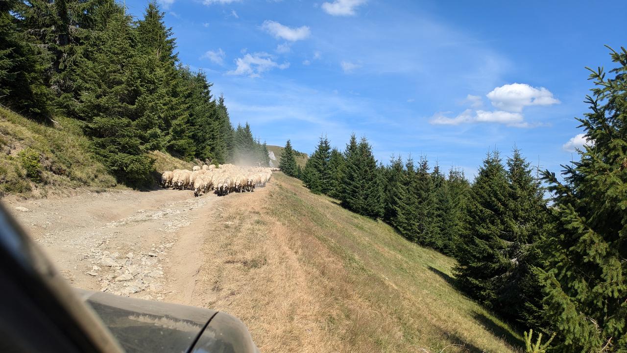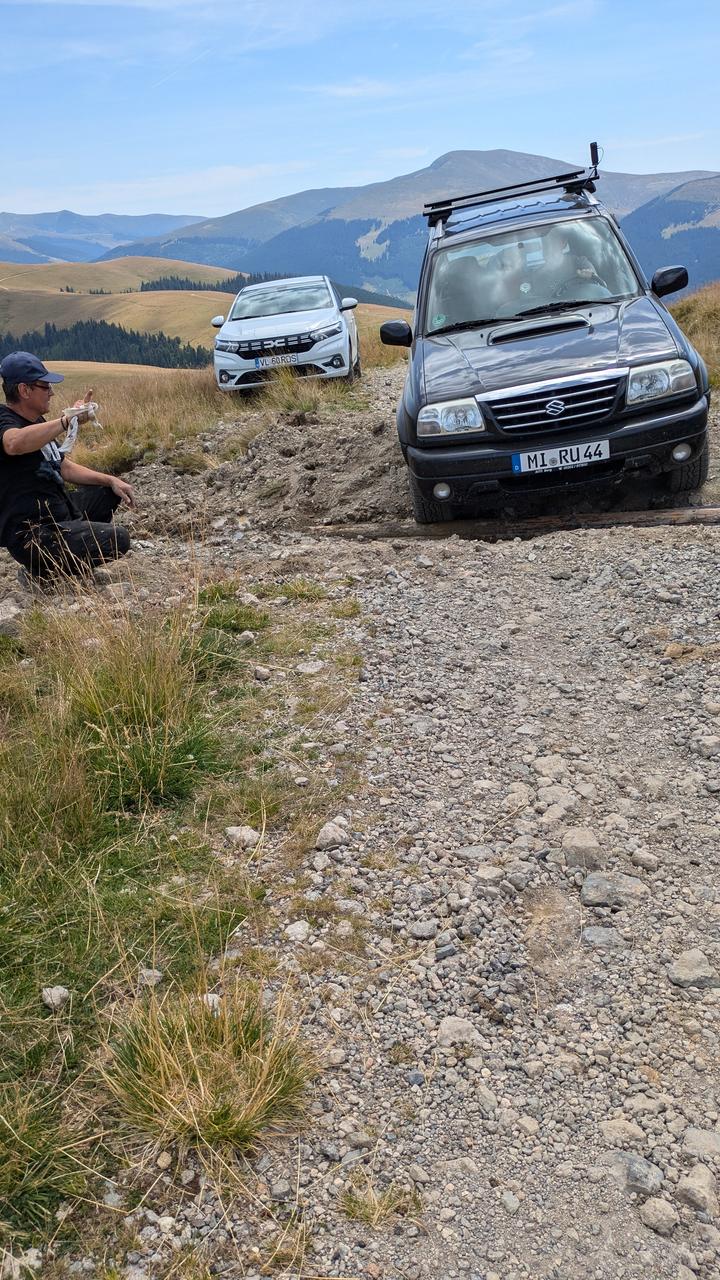 Man hat fast die ganze Zeit über einen irren Weitblick auf die Karpaten mit klar sichtbarer Baumgrenze (bis auf ein paar Ausreißer). Einem Abzweig, der von der „Strategica“ wegführt,  konnten wir nicht widerstehen, hatten wir doch dort oben eine „Bushaltestelle“ erspäht. Ganz zu Beginn ist ein weißer Citroen (Kleinwagen) an uns vorbei gefahren und wen treffen wir auf diesem Abstecher, der mit unseren 4×4 kaum zu bewältigen war? Den weißen Citroen samt Besitzer! Der hatte an einer von Wasser ausgewaschenen Stelle Probleme bekommen und konnte nicht weiter. Er werkelte schon mit Wagenheber rum – was auch immer er damit vorhatte. Jedenfalls hatte er sich damit schlimm am Finger verletzt. Das Blut sickerte schon durch seinen provisorischen Verband. Schnell verschwand er kurz in seinem Auto, parkte es um damit wir mehr Platz haben, riss sich noch einige Textiltücher zurecht und wickelte sie um seine Finger. Trotz Allem hat er sofort einige Hölzer über die Schikane gelegt und meinte mit Handgesten, dass wir durchfahren sollen 😀 Er hob vier Finger und wollte wissen ob wir Allrad haben. „Ja? Dann klappt das schon!“ – lies er uns auf gebrochenem aber verständlichem rumänischem englisch wissen. Ich (Marco) war skeptisch. Die Stelle sah trotz der Hölzer nicht gut aus. Der Rumäne fuchtelte derweil mit seinen blutigen Fingern weiter und meinte wir sollen ein Stück zurück und oben über die Wiese fahren. Geht doch auch mit Allrad. Joah, würde wohl auch gehen. Wieso auch immer Strasse fahren? Aber nee, nu hat er die Hölzer so schön drappiert, also rüber da! Wir haben es versucht und es hat natürlich geklappt. Wir sind dann noch eine Weile mit dem Mann im Gespräch gewesen, er hat uns etwas die Gegend und Natur erklärt. An der Hängen jenseits der Baumgrenze wachsen flache Büsche mit Blauberen, gut für den Magen (aus den Blättern macht man Tee, der ist gut für die Lunge – wusstet ihr das?). Kurz darauf kam noch ein Schäfer mit seinen 250 Schafen, einer Ziege und einem Esel dazu. Einmal im Flow haben auch wir mit den beiden Selfies gemacht. So nette Leute hier 😍😍 Übrigens haben wir etwas später festgestellt, dass wir hier auf fast 2000 Metern ja feinstes Internet haben. Verrückt – aber so konnten wir uns Dank Google Übersetzer mit den beiden unterhalten (daher auch die Info mit den Anzahl der Schafe – selber gezählt haben wir nicht 😅)