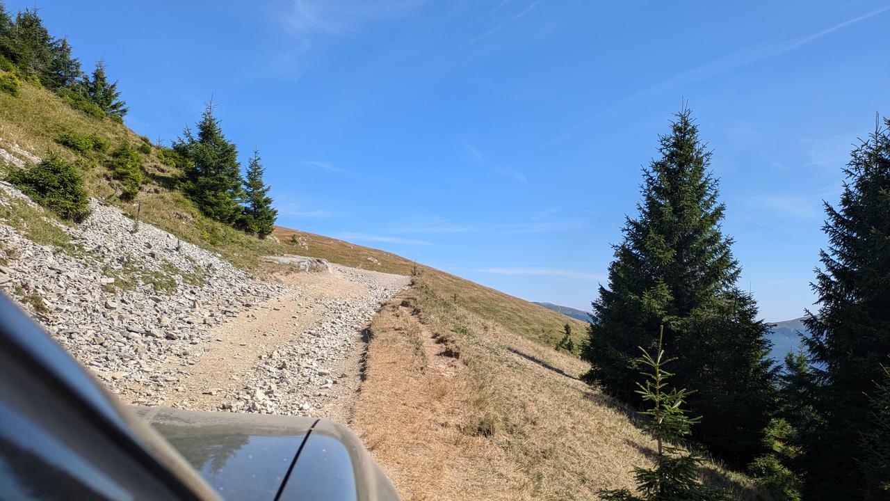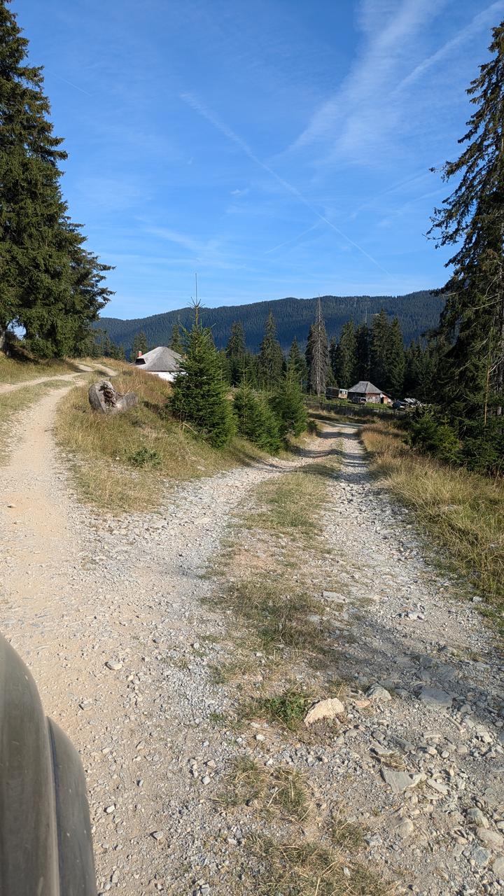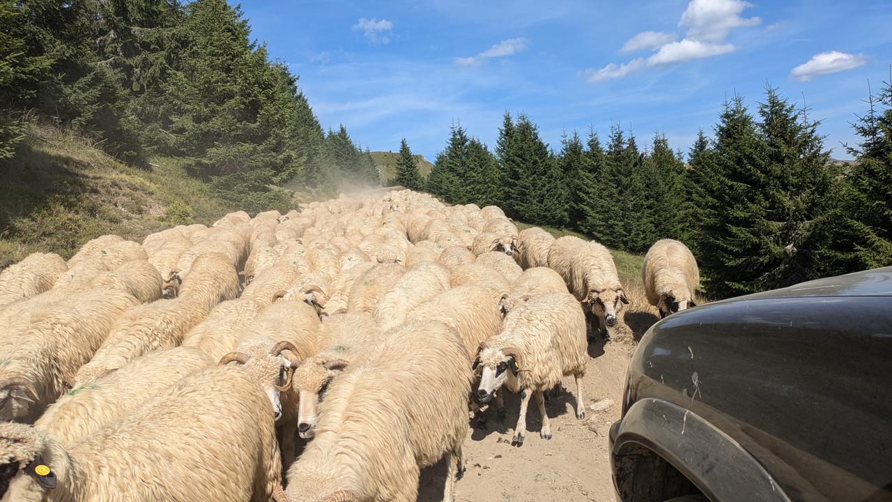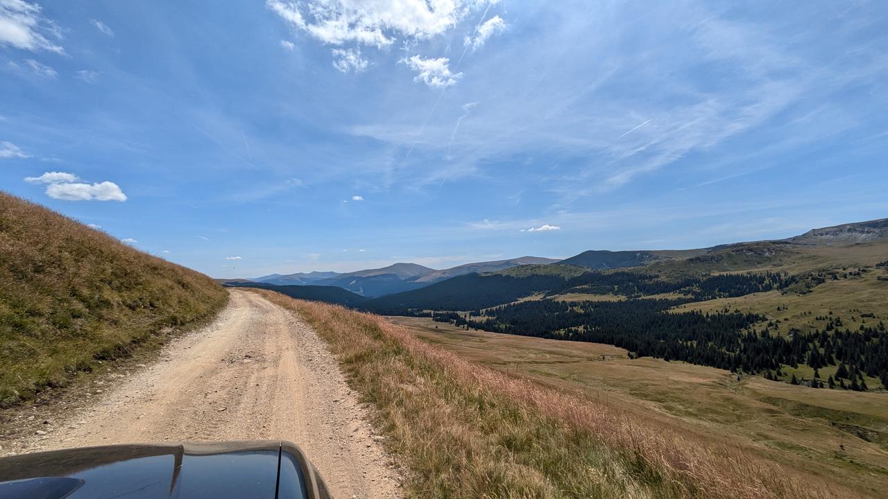 Man hat fast die ganze Zeit über einen irren Weitblick auf die Karpaten mit klar sichtbarer Baumgrenze (bis auf ein paar Ausreißer). Einem Abzweig, der von der „Strategica“ wegführt,  konnten wir nicht widerstehen, hatten wir doch dort oben eine „Bushaltestelle“ erspäht. Ganz zu Beginn ist ein weißer Citroen (Kleinwagen) an uns vorbei gefahren und wen treffen wir auf diesem Abstecher, der mit unseren 4×4 kaum zu bewältigen war? Den weißen Citroen samt Besitzer! Der hatte an einer von Wasser ausgewaschenen Stelle Probleme bekommen und konnte nicht weiter. Er werkelte schon mit Wagenheber rum – was auch immer er damit vorhatte. Jedenfalls hatte er sich damit schlimm am Finger verletzt. Das Blut sickerte schon durch seinen provisorischen Verband. Schnell verschwand er kurz in seinem Auto, parkte es um damit wir mehr Platz haben, riss sich noch einige Textiltücher zurecht und wickelte sie um seine Finger. Trotz Allem hat er sofort einige Hölzer über die Schikane gelegt und meinte mit Handgesten, dass wir durchfahren sollen 😀 Er hob vier Finger und wollte wissen ob wir Allrad haben. „Ja? Dann klappt das schon!“ – lies er uns auf gebrochenem aber verständlichem rumänischem englisch wissen. Ich (Marco) war skeptisch. Die Stelle sah trotz der Hölzer nicht gut aus. Der Rumäne fuchtelte derweil mit seinen blutigen Fingern weiter und meinte wir sollen ein Stück zurück und oben über die Wiese fahren. Geht doch auch mit Allrad. Joah, würde wohl auch gehen. Wieso auch immer Strasse fahren? Aber nee, nu hat er die Hölzer so schön drappiert, also rüber da! Wir haben es versucht und es hat natürlich geklappt. Wir sind dann noch eine Weile mit dem Mann im Gespräch gewesen, er hat uns etwas die Gegend und Natur erklärt. An der Hängen jenseits der Baumgrenze wachsen flache Büsche mit Blauberen, gut für den Magen (aus den Blättern macht man Tee, der ist gut für die Lunge – wusstet ihr das?). Kurz darauf kam noch ein Schäfer mit seinen 250 Schafen, einer Ziege und einem Esel dazu. Einmal im Flow haben auch wir mit den beiden Selfies gemacht. So nette Leute hier 😍😍 Übrigens haben wir etwas später festgestellt, dass wir hier auf fast 2000 Metern ja feinstes Internet haben. Verrückt – aber so konnten wir uns Dank Google Übersetzer mit den beiden unterhalten (daher auch die Info mit den Anzahl der Schafe – selber gezählt haben wir nicht 😅)