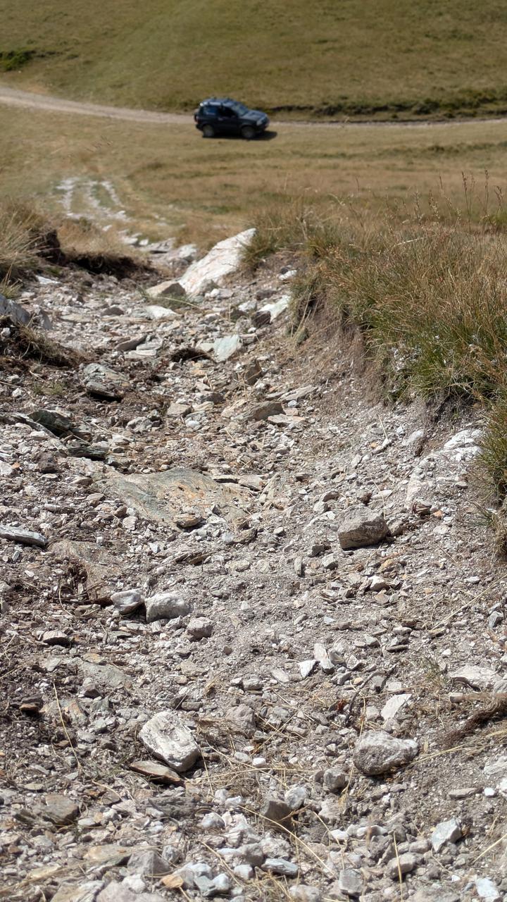 Fassen wir nochmal zusammen: Es wird dunkel. Es geht immer noch bergauf. Der Untergrund ist sandig und rutschig. Unseren Vitara hat es schon mehrfach versetzt. Eine falsche Lenkbewegung könnte dazu führen, dass wir in eine solche Spalte abrutschen. Das würde ggfs. bedeuten, dass wir uns aus eigener Kraft nicht mehr befreien könnten oder sogar noch schlimmer das Fahrzeug schwer beschädigen würden.