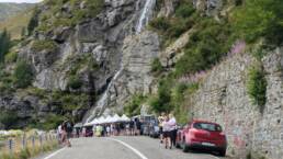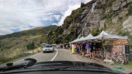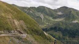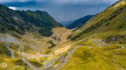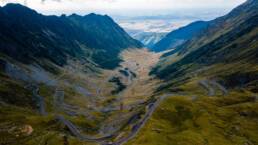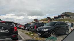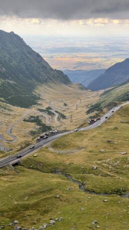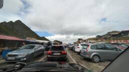 Als für uns die „normale“ Transfăgărășan weiterging, fing es doch tatsächlich an zu regnen :-O wir hatten doch alle Wetter-Apps gecheckt – der Regen sollte HIER nicht sein, also noch nicht. Naja, was soll, das ist ja kein Grund zu verzagen. Und wieder, so schlimm wars gar nicht, es klarte schon bald wieder auf (juhu). Wenn wir gestern schon gedacht haben, die Transalpina wäre voll, wurde es heute nochmal getoppt. An wirklich jedem Spot oder Parkplatz standen etliche Fahrzeuge. Die Einheimischen wissen das sehr gut zu nutzen und stellen genau dort ihr Stände mit allerlei regionalen Essen, Snacks und Andenken auf. Dadurch wird es überall noch voller. Wir standen sogar im Stau! Im Tunnel direkt vor dem Scheitelpunkt, von wo die Seilbahn ins Tal gondelt und man den perfekten Panoramablick auf die faszinierenden Schleifen der Straße hat.