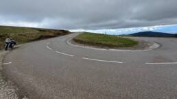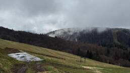 Der Aufstieg zur Route des Crêtes war landschaftlich grandios, aber auch fordernd: 3 Grad, Wind, Nebel, Regen.Auf den ersten Höhenmetern dann eine weitere Erinnerung an die Jahreszeit: Schnee neben der Straße. Starke Schräglagen waren auf den nassen, teils moosigen Straßen im Wald keine gute Idee – also wurde defensiv gefahren.