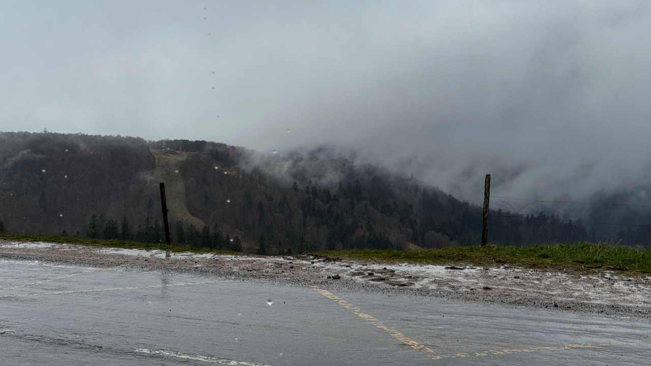 Der Aufstieg zur Route des Crêtes war landschaftlich grandios, aber auch fordernd: 3 Grad, Wind, Nebel, Regen.Auf den ersten Höhenmetern dann eine weitere Erinnerung an die Jahreszeit: Schnee neben der Straße. Starke Schräglagen waren auf den nassen, teils moosigen Straßen im Wald keine gute Idee – also wurde defensiv gefahren.