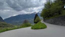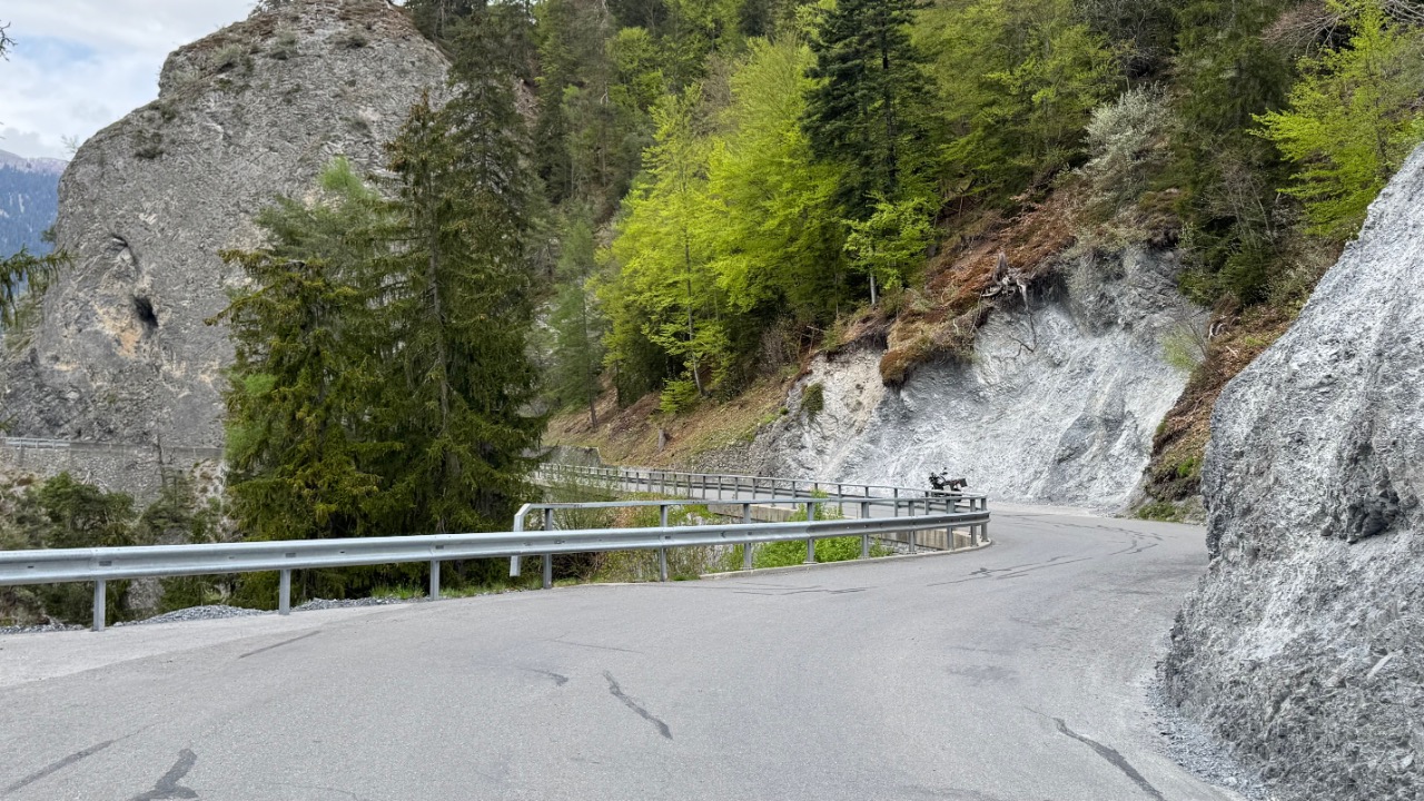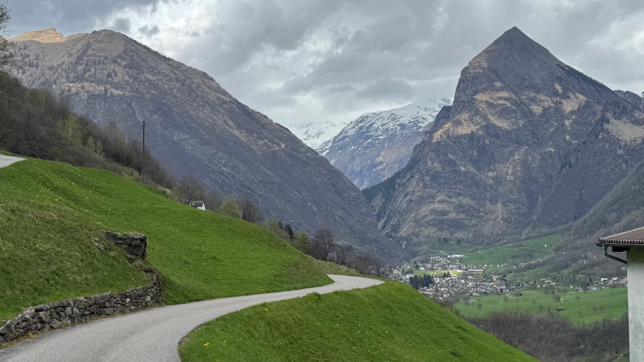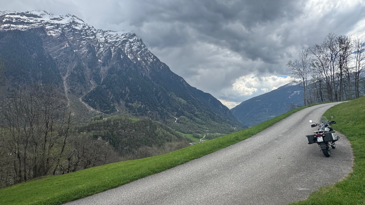In der Region um Ponto Valentino wurde es dann ernst. Die Strecke war extrem schmal und kurvig, oft gerade mal breit genug für ein Fahrzeug. Ich fuhr größtenteils im ersten Gang, denn hinter jeder Biegung konnte plötzlich Gegenverkehr auftauchen. Die Straße wand sich durch die Hänge, verlassen wirkende Häuser tauchten am Rand auf, tief unten lagen Torre und Dangio im Tal. Ein Wanderer, ein paar Autos – ansonsten war ich auf mich gestellt. Ein intensiver Abschnitt – langsam, fordernd, aber faszinierend.