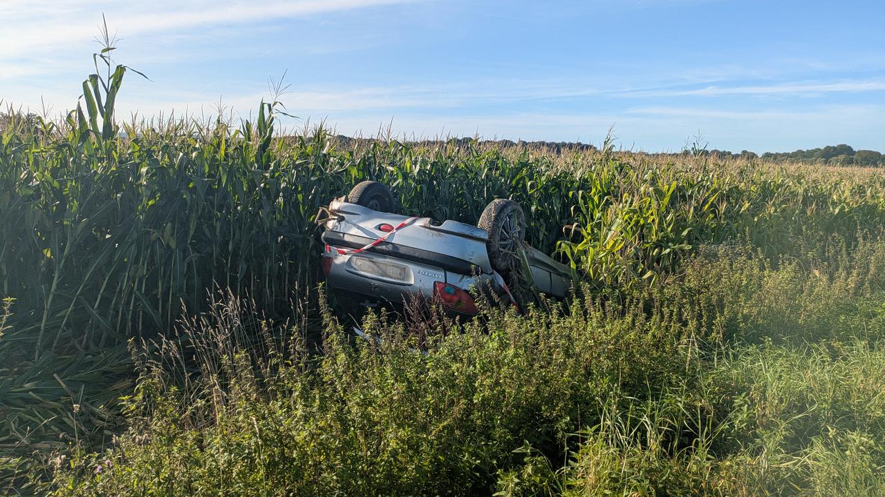 So gestärkt nahmen wir Fahrt auf, bis wir auf ein eher ungewöhnliches „Straßenbild“ stießen: Mitten im Maisfeld lag ein Auto – auf dem Dach. Wir sind extra umgedreht, um zu schauen, ob Hilfe nötig ist. Doch es stellte sich heraus: alter Unfall, mit Flatterband abgesperrt. In Deutschland wäre das längst weggeräumt, hier liegt es einfach noch im Feld herum.