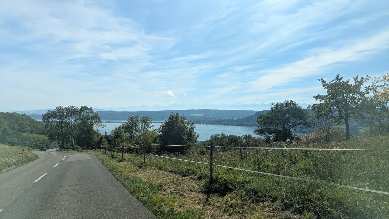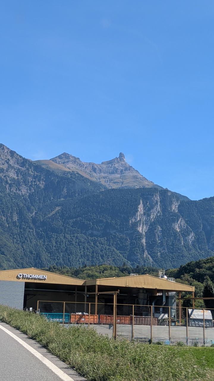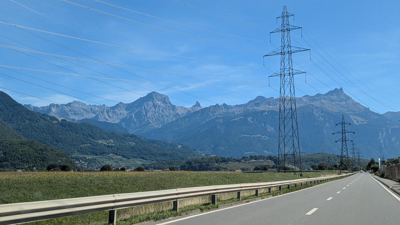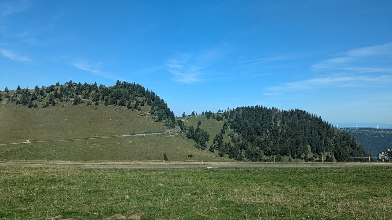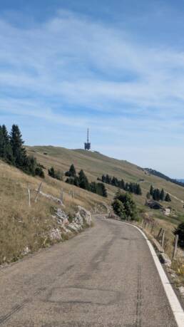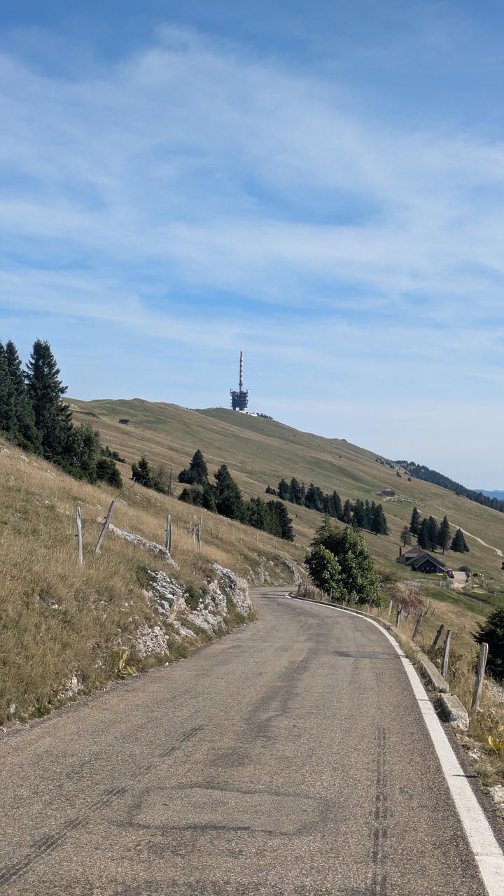 Pannen in Frankreich gab es schon genug (siehe Alpentour 2025) – also Roaming aus und ab in die Schweiz. Der Grenzübergang war recht unspektakulär – dafür wurde es landschaftlich immer schöner: erst sanfte Hügel, dann zunehmend steile Anstiege. Am Col du Chasseral in der Schweiz erreichten wir mit 1.526 Metern unseren höchsten Punkt des Tages. Oben thront eine gewaltige Sendestation mit Antennen, die Regine augenzwinkernd als „Raketenbasis“ bezeichnete – in Anlehnung an die Transalpina, wo sie eine ähnliche Station so getauft hat. Raketen waren zwar keine zu sehen, aber die Aussicht auf die Alpen war grandios!