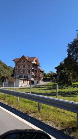 In Thusis haben wir eine Pause bei Café Gyger eingelegt. Und was soll man sagen: Milchkaffee und Torte bzw. Cappuccino und Torte waren so gut, dass wir einfach mal 8/5 Punkte vergeben. Over the top, aber gerechtfertigt. Marco kennt den Laden noch von seinen Motorradtouren. Im Parkhaus erleben wir eine ungewöhnliche Szene: drei Schweizer trainieren dort mit einem Suchhund.