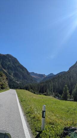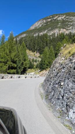 St. Moritz haben wir links liegen gelassen und sind direkt weiter Richtung italienische Grenze. Laut Navi sollte noch ein Pass kommen. Statt einem Namen gab es nur eine Hinweistafel: „Mit Google Maps bitte nicht hier langfahren“. Hm. Aber kein Verbotsschild, also los! Wir waren uns einig: Wenn Schotter kommt, drehen wir um. Doch die Straße blieb schmal, kurvenreich und asphaltiert. Unten im Tal tauchten erste Apfelfelder auf.