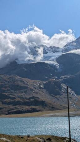 Nach dem Albula wartete das nächste Highlight: der Berninapass. Statt Leitplanken lagen hier große Strohballen in den Kurven – eine sehr eigene Form der „Sicherung“. Oben eröffnete sich ein Panorama mit schneebedeckten Gipfeln. Und dann: der Blick auf den Palü-Gletscher am Piz Palü, flankiert von Morteratsch- und Persgletscher. Ein gewaltiger Anblick – und ein guter Anlass, sich zu fragen, warum manche Berge voller Eis und Schnee sind, während gleich hohe Nachbarn kahl daliegen. Die Antwort liegt in ihrer Ausrichtung und im Klima: Nordhänge bekommen viel weniger Sonne und halten Schnee deutlich länger, während Südseiten schneller auftauen. Dazu kommt, dass an manchen Gipfeln mehr Niederschlag hängenbleibt oder alte Gletscherreste überdauern – so entstehen diese eindrucksvollen Unterschiede direkt nebeneinander.