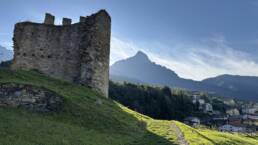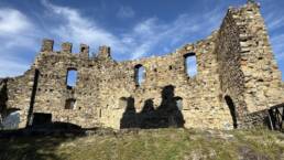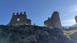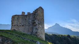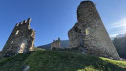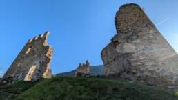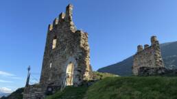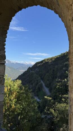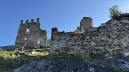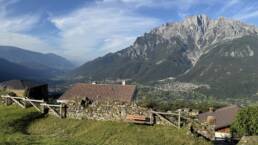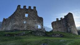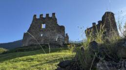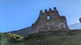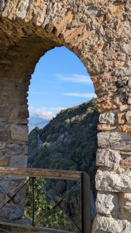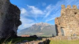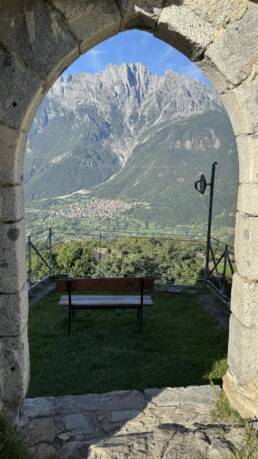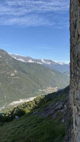 Als Erstes erklommen wir die fußläufig erreichbare Rocca di Cimbergo. Die Ruine thront auf einem Felsen über dem Tal – ein herrliches Fleckchen Erde. Hier fanden Archäologen Spuren von Siedlungen aus der Bronzezeit, später eine Burg aus dem 12. Jahrhundert, die in den Machtkämpfen der Visconti zerstört, dann wieder aufgebaut wurde. Heute sind noch Mauerreste sichtbar, die von einer langen Geschichte zwischen Herrschaft und Verfall erzählen. Uns hat es dort oben sehr gut gefallen – ein stiller Ort mit weitem Blick ins Val Camonica.