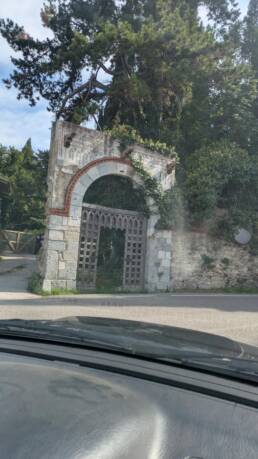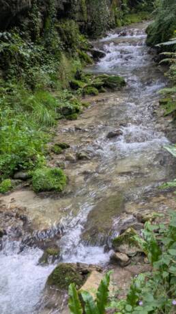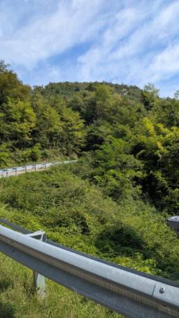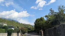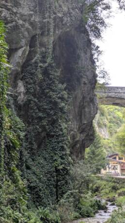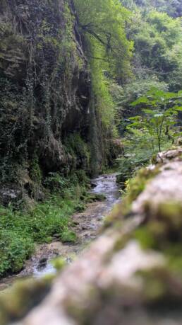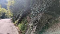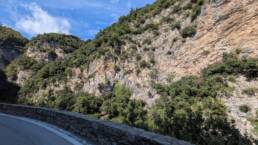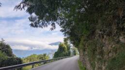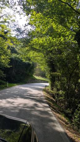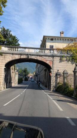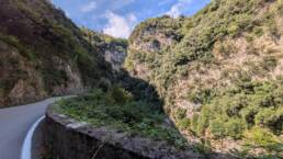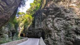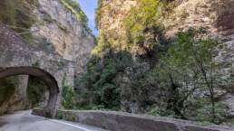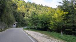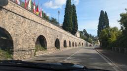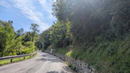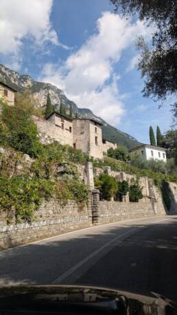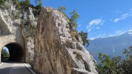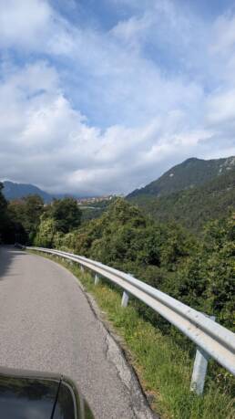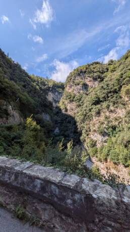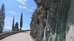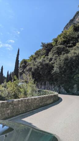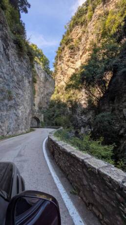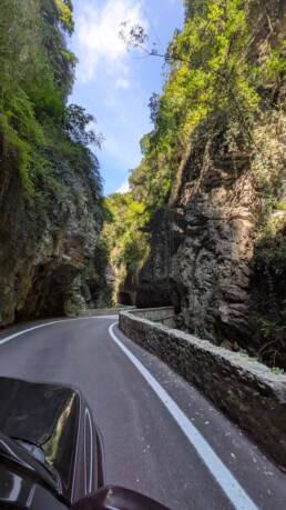 In der ersten Kurve montierten wir die 360°-Kamera aufs Auto und los ging’s! Dieser erste Abschnitt ist Einbahnstraße, was gut so war. Die Straße schraubt sich romantisch in die Schlucht: schmal, mit kleinen Tunneln und Felsüberhängen, grob behauen, ein Bachlauf unter uns, der in den Gardasee mündet. Bei gerade einmal 277 Höhenmetern wuchsen noch viele Bäume und Büsche, was das Ganze noch stimmungsvoller machte.