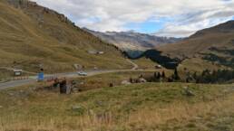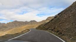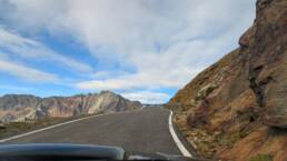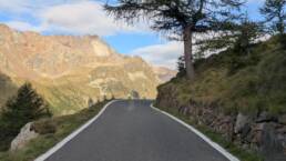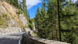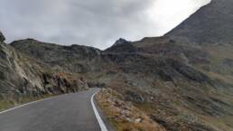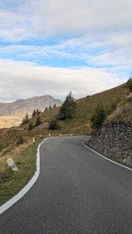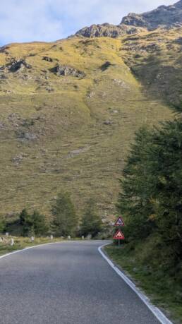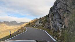 Dieser Pass war so früh am Morgen angenehm leer – was auch gut so war. Einige Stellen sind extrem schmal, aber herrlich zu fahren. Kurve um Kurve schlängelt er sich bergauf bis auf satte 2.640 Meter Höhe. Am Scheitelpunkt gab’s endlich den ersehnten Cappuccino (4/5 Tassen) und dazu zwei Schoko-Cannelloni. Die sahen in der Auslage fantastisch aus – erwiesen sich aber als herbe Enttäuschung: trocken, fad, einfach kein Genuss. Auf der Skala leider nur 1 von 5 Punkten.