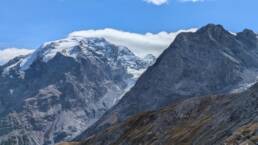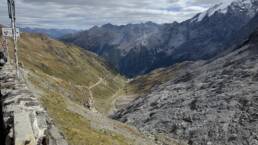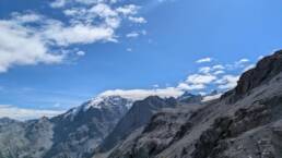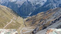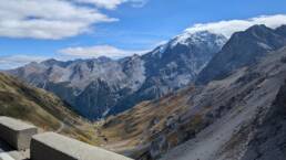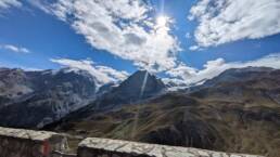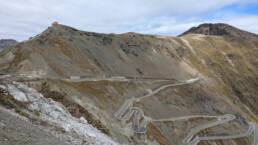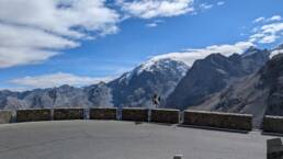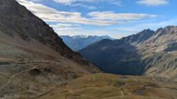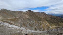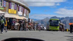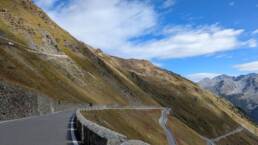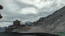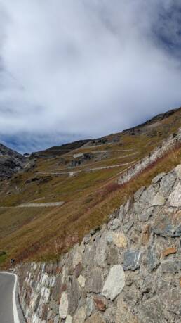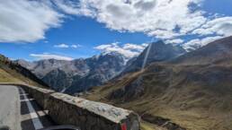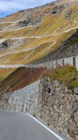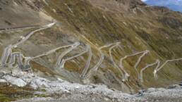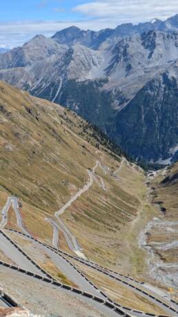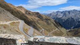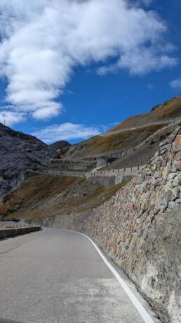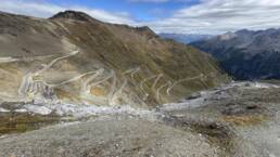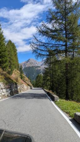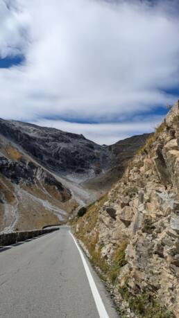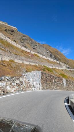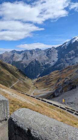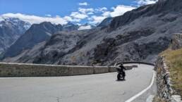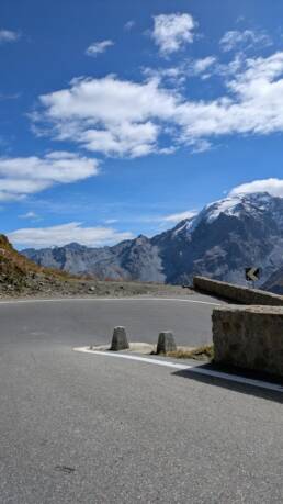 Wenig später erreichten wir schon die Zufahrt zum Stelvio – und machten uns zusammen mit vielen anderen auf den Weg nach oben. Wir kamen von der weniger spektakulären Seite, doch oben war es rappelvoll: ein großes Treffen von Bikern und Sportwagen. Viel zu viel Trubel für uns. Nach kurzem Souvenir-Stopp warteten wir auf den richtigen Moment – und starteten Punkt 12 Uhr bei bestem Wetter die Abfahrt. Der perfekte Zeitpunkt: Die Straße war erstaunlich frei, wir hatten die berühmten Serpentinen fast für uns alleine. Ein unvergesslicher Moment – die Kurven, die Kulisse, der majestätisch im Sonnenlicht strahlende Stelvio-Gletscher. Schöner hätten wir es uns nicht wünschen können.