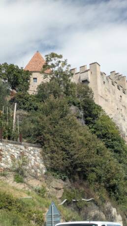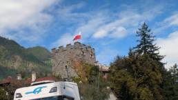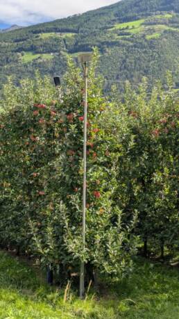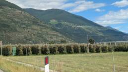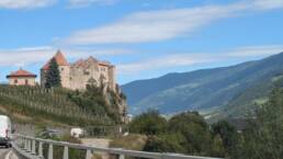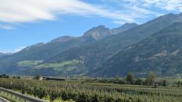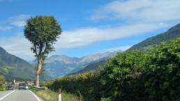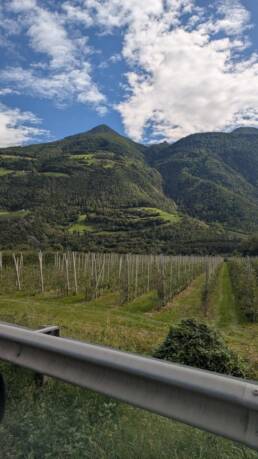 Von dort ging es weiter Richtung Österreich. Wir rollten an endlosen Apfelplantagen vorbei – Reihen über Reihen in Rot, Grün und fast schon Lilatönen. Dazwischen Hecken mit Hopfendolden und Bäume mit stacheligen Früchten, die an Kastanien erinnerten.