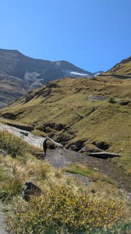 Statt Museum lockte zuerst ein Stollen: der Gamsgrubenweg. Sechs Tunnel mit insgesamt 1019 Metern Länge führen entlang der Pasterze direkt in Richtung Gletscher. Jeder Tunnel erzählt eine andere Geschichte: von Sagen, von Alpinisten, von der Gletscherwelt. Beeindruckend und bedrückend zugleich, denn die Pasterze, Österreichs größter Gletscher, schmilzt rasant. Seit 1852 hat er fast die Hälfte seiner Fläche verloren, allein 2022/23 über 200 m Länge. Ein sichtbarer Beleg für den Klimawandel. Der Weg endet aktuell an Tunnel 6 – dahinter ist er gesperrt.